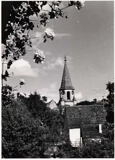 Kirche, Kennwort BergquellWannweiler Kirche mit Blumen, Standpunkt Treppenaufgang von Haus Flaschner Kemmler, in der Kusterdinger Straße. Heinz Wolpert reichte diese Aufnahme ein.